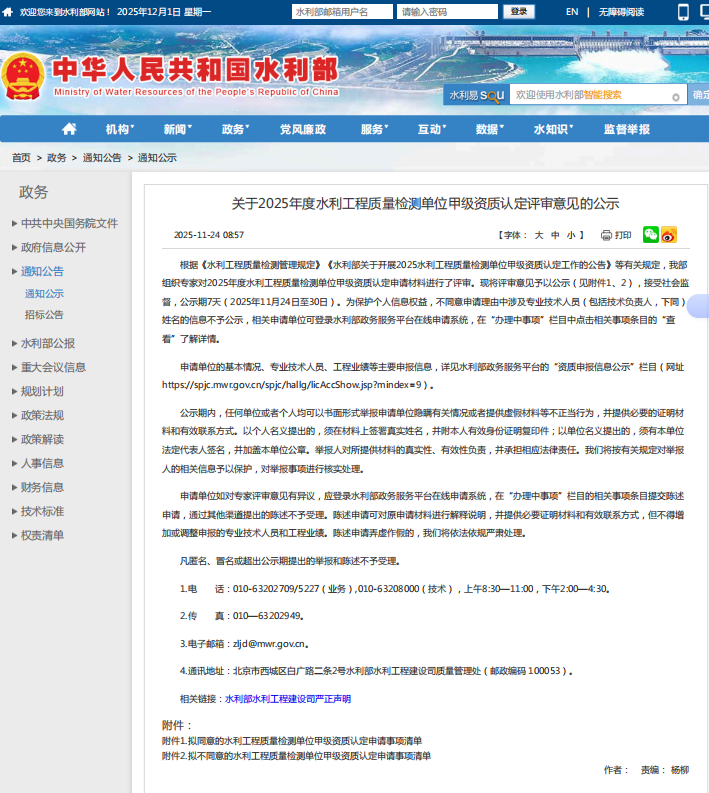 喜報(bào)|湖北華旭檢測有限公司順利通過水利部兩項(xiàng)甲級檢測資質(zhì)公示