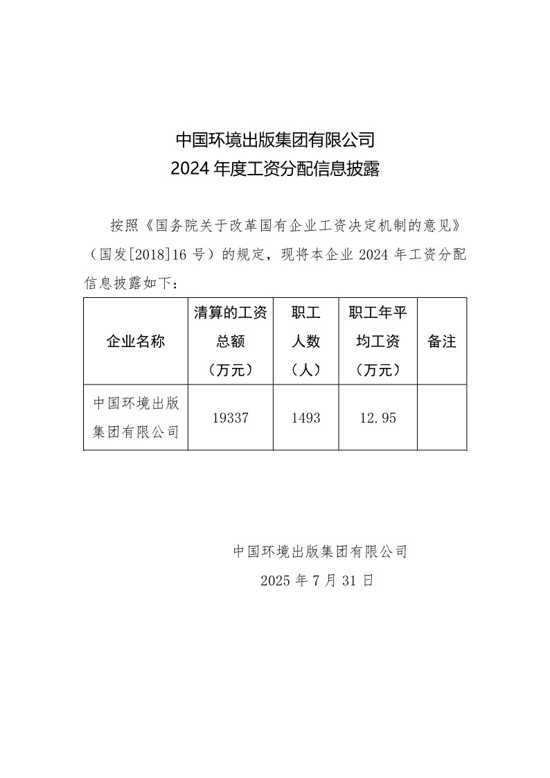 中國環境出版集團有限公司2024年工資分配信息披露